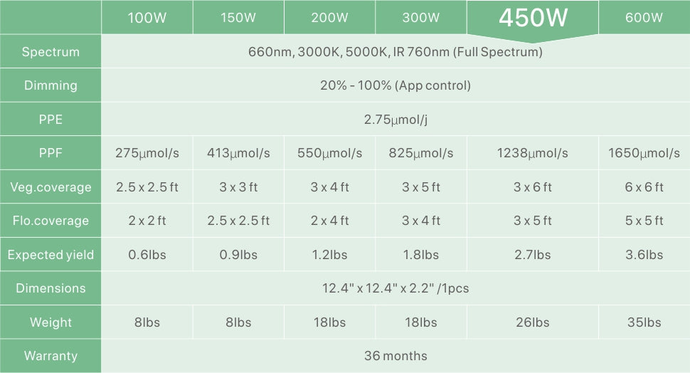 Groplanner 450W O Series-WiFi Control FULL SPECTRUM LED Grow Lights utilize the latest in high-yielding LEDs technology today-2835 type chips which are better than Samsung LM301B diodes, high Energy Efficiency with 2.75 umol/J, PPF 1237.5μmol/s,create better canopy light penetration. Groplanner 450W O Series only consume 450w, running 50% less power than the HPS or Blurple lamps, and still was 50% more harvest. The Veg.coverage is 3x6ft, Flower coverage is 3x5ft, Expected yield ≈2.7lbs.