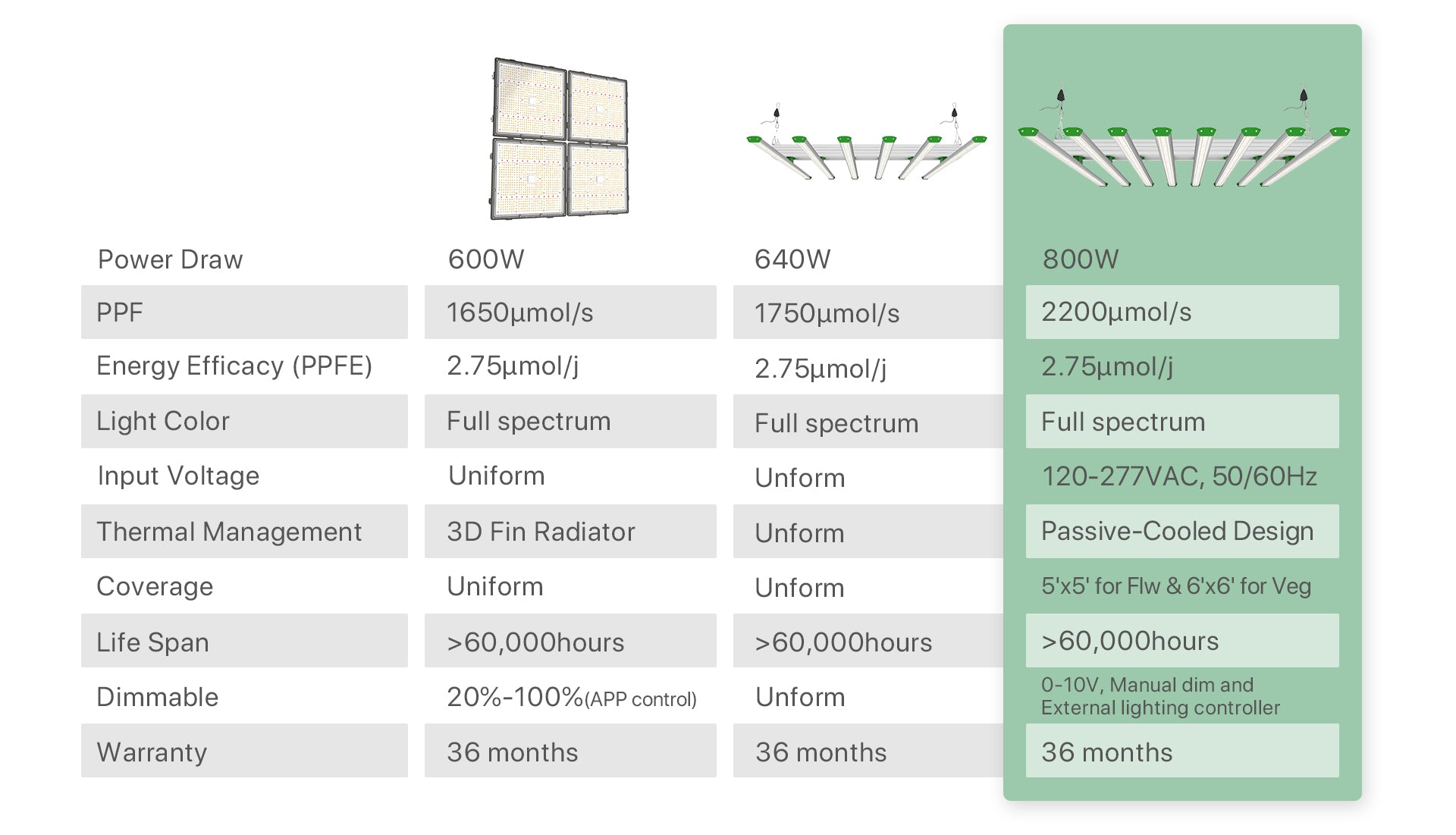 Groplanner LED Grow Lights offer higher light intensity, better coverage, more advanced features (timer and dimmer control), same warranty, ETL Listed and SIGNIFICANT Savings.