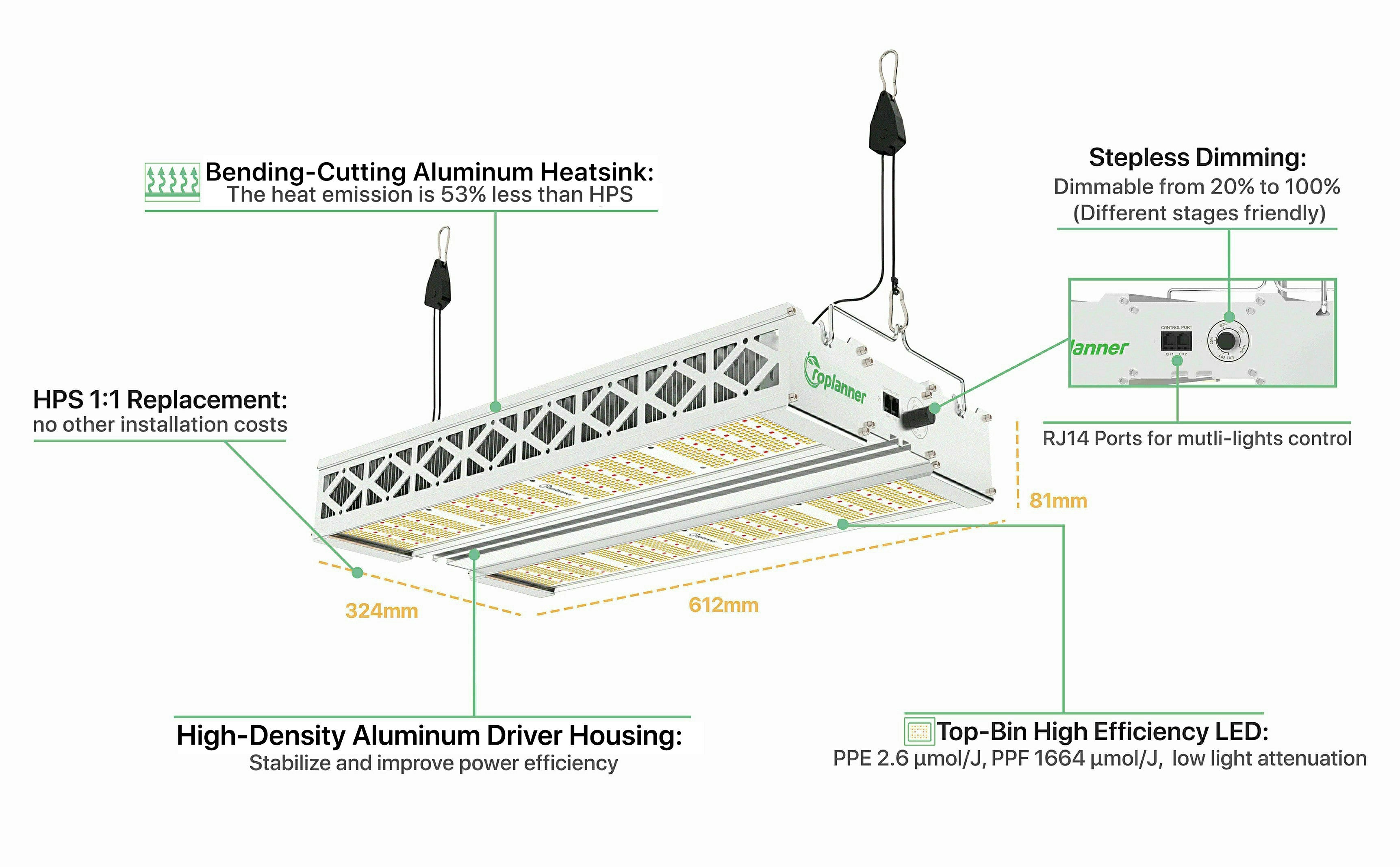 Groplanner TPO series LED grow light with built-in dimming knob provides growers with greater flexibility. In addition, the light fixture can be connected in series through RJ14 network cable for multi-lights control, which is the best choice for large-area growers, and can connect up to 100 lamps.