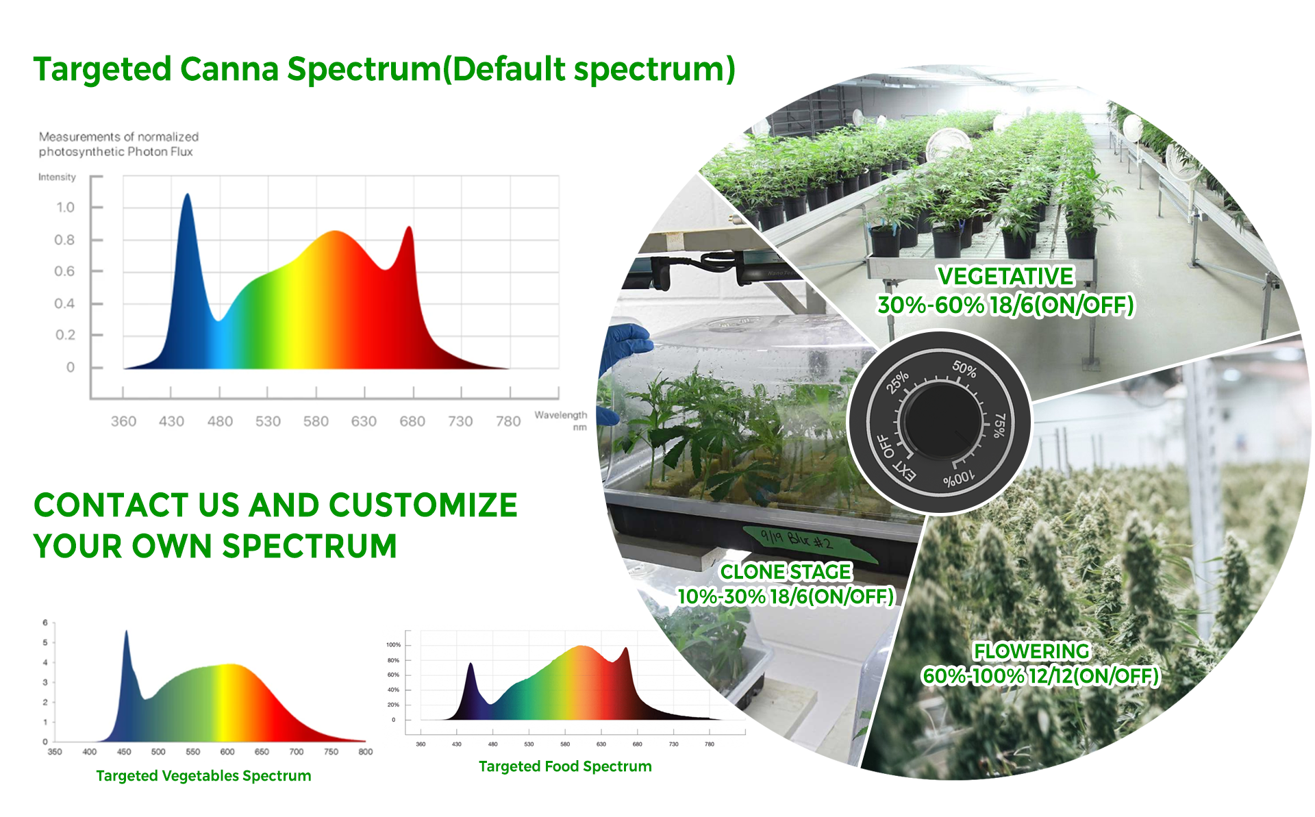 Groplanner is delicated to cooperating with hundreds of licensed growers and biological laboratories to research the ideal full spectrum for different plant. Enhanced blue and red light as a specific spectral combination, boosting plant growth while improving the year-round yield and product quality.Please contact our lighting expert to custom your own light specturm for your plants. CONTACT US